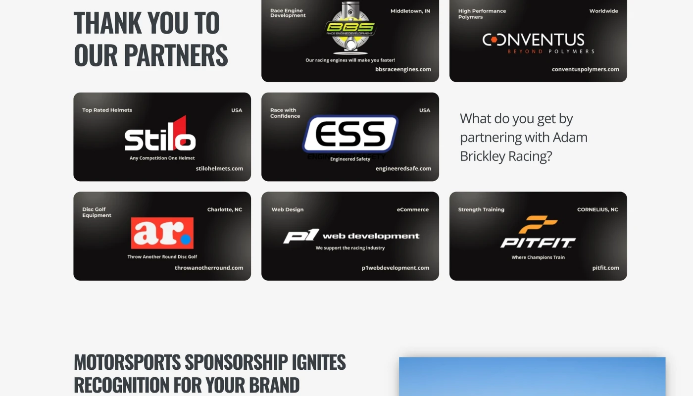 We built a professional website that positioned Adam as a legitimate competitor worth backing. The clean, modern design immediately elevated his credibility, giving his father a tool to point sponsors to rather than relying on verbal pitches alone. The site showcased Adam’s racing history, achievements, and trajectory in a format that sponsors expect from serious racers. While the family’s racing focus has since shifted to Legend Cars and Karts, the site continues to serve as their primary credibility asset in funding conversations.